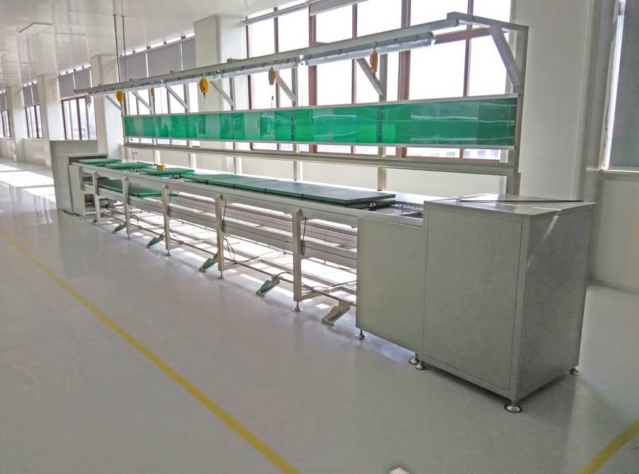 采用倍速鏈牽引, 工板可以自由傳送, 采用咀擋器定位可以使工件自由運動和停止。